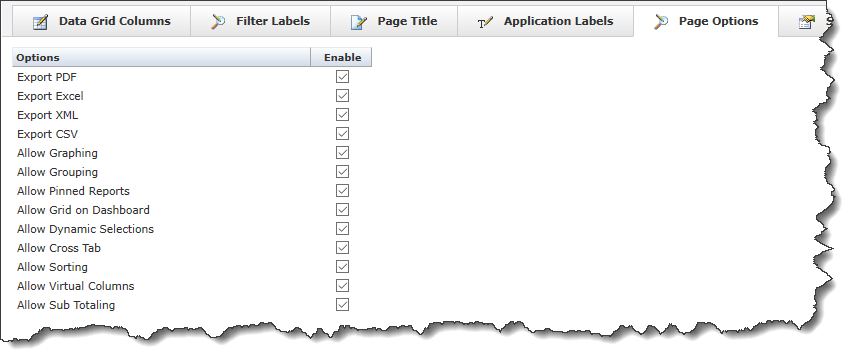 The Page Options tab allows Administrators to define, on a global report level, which additional features can be enabled or disabled for your end users for a particular reporting page. This setting must be administered at the Page level (one report at a time) and can also be managed, for Custom Reports, using the Page Builder Wizard when creating or editing Custom Reporting Pages. In the Page Builder, this step is known as Selecting Page Options.